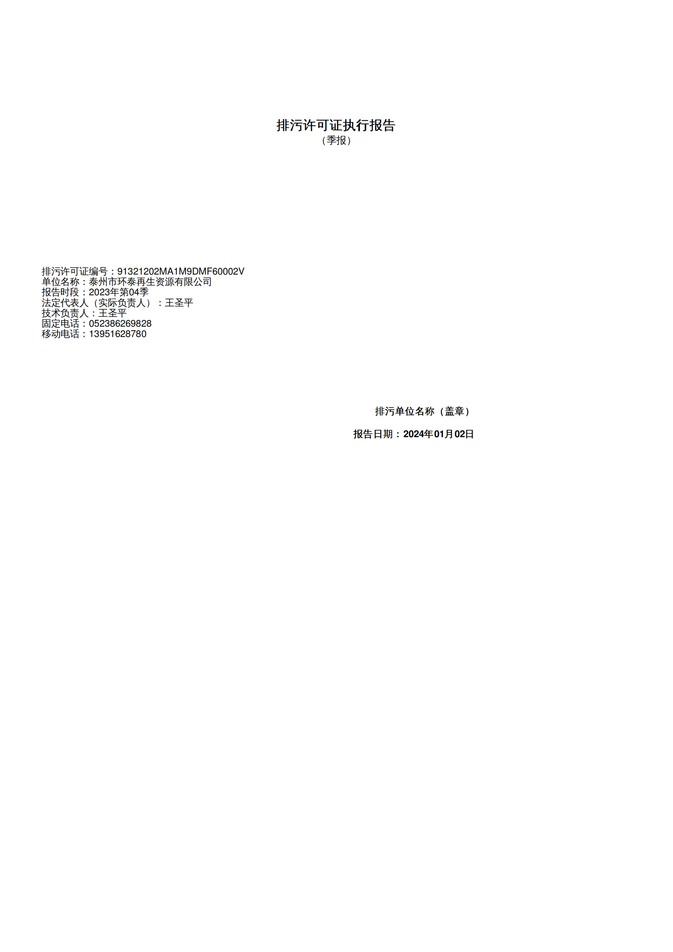 泰州市环泰再生资源有限公司排污许可证执行报告2023年第四季度季报
