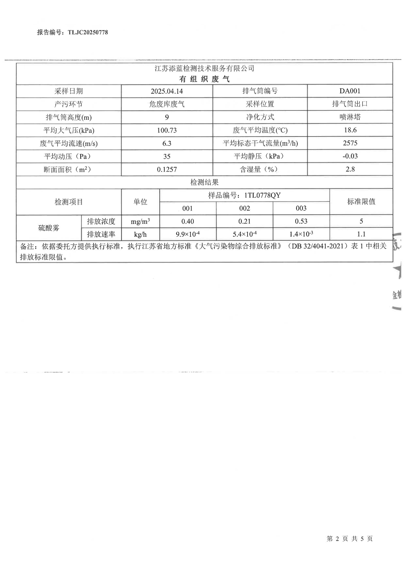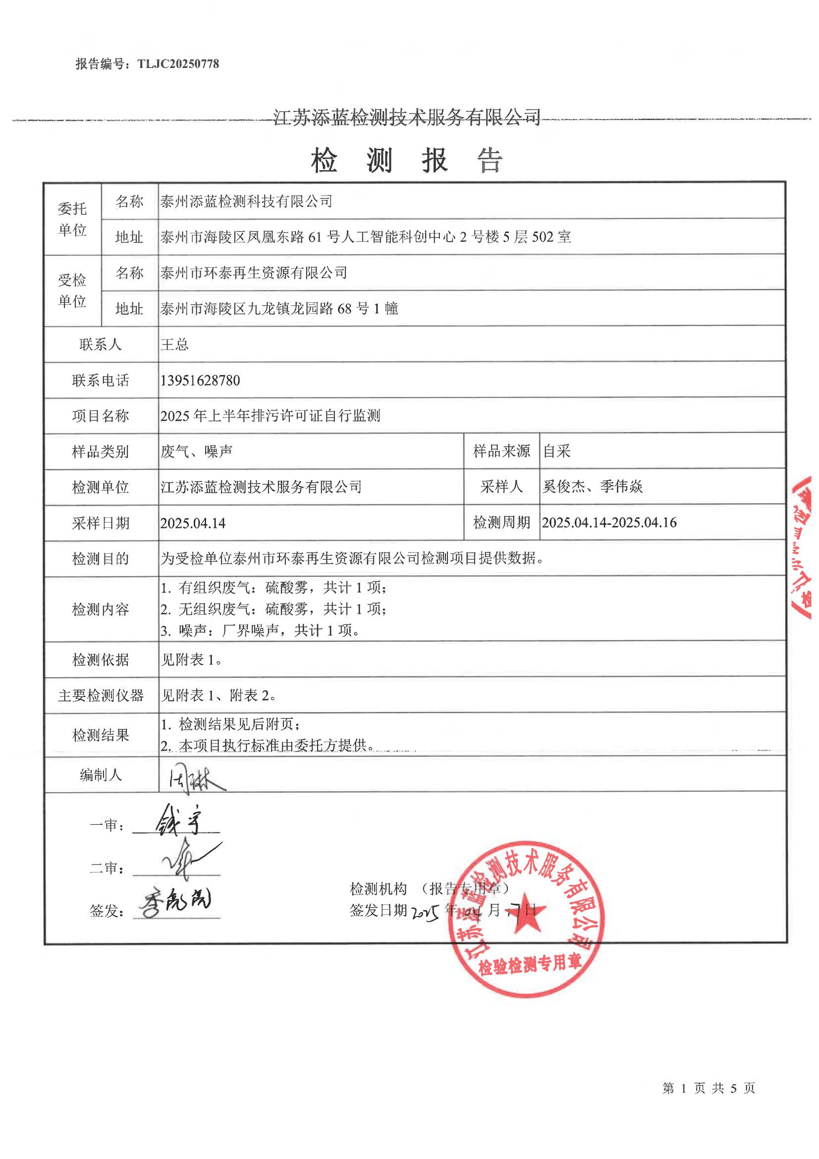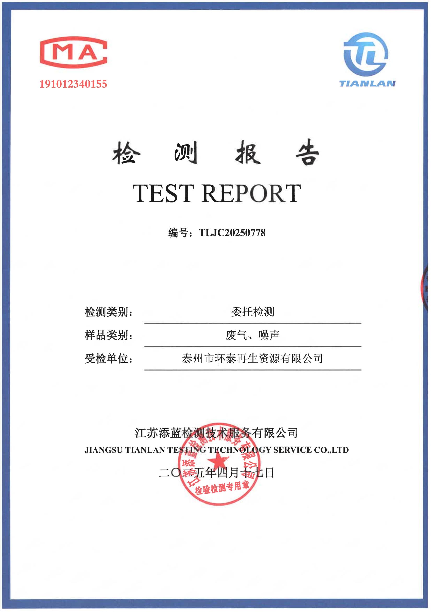 泰州市环泰再生资源有限公司2025年上半年自行检测报告